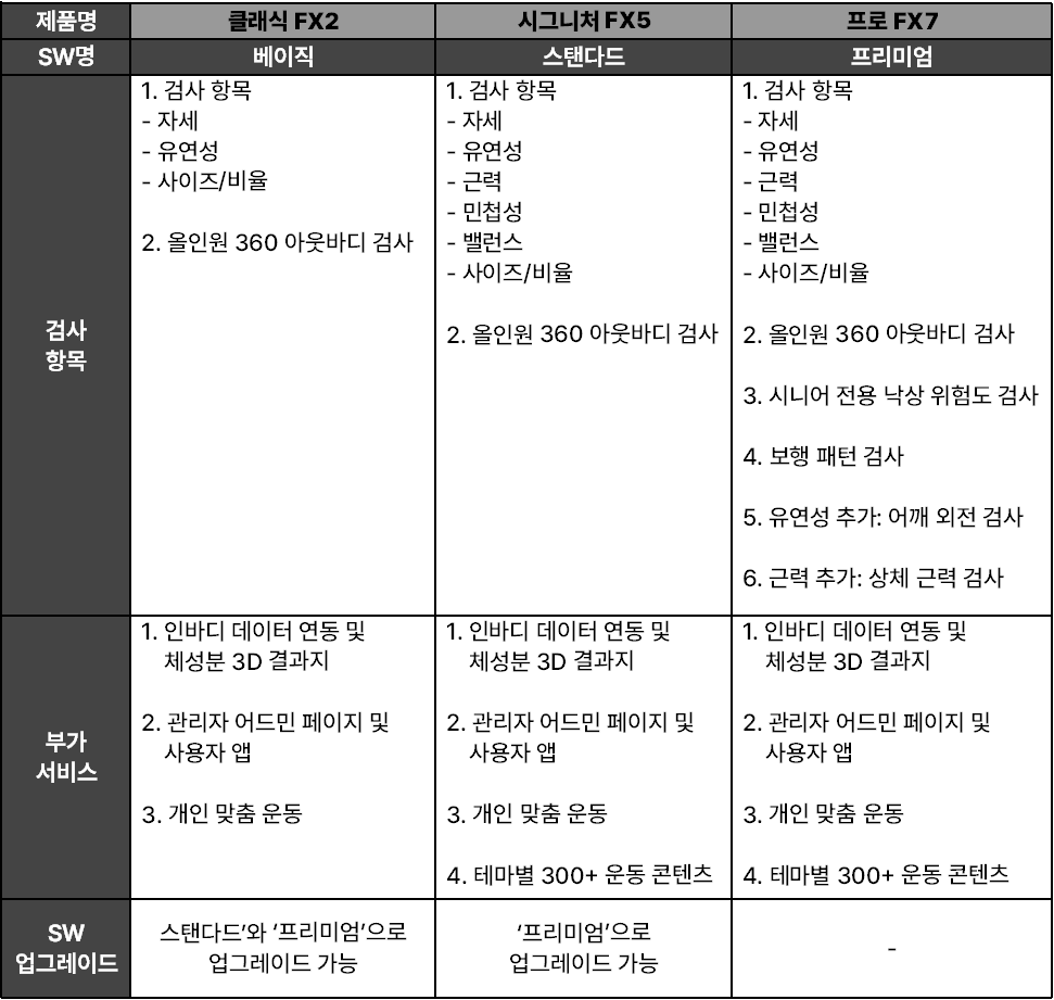 | 검사 항목 | 1. 검사 항목 - 자세 - 유연성 - 사이즈/비율 2. 올인원 360° 아웃바디 검사 | 1. 검사 항목 - 자세 - 유연성 - 근력 - 민첩성 - 밸런스 - 사이즈/비율 2. 올인원 360° 아웃바디 검사 | 1. 검사 항목 - 자세 - 유연성 - 근력 - 민첩성 - 밸런스 - 사이즈/비율 2. 올인원 360° 아웃바디 검사 3. 시니어 전용 낙상 위험도 검사 4. 보행 패턴 검사 5. 유연성 추가: 어깨 외전 검사 6. 근력 추가: 상체 근력 검사 |