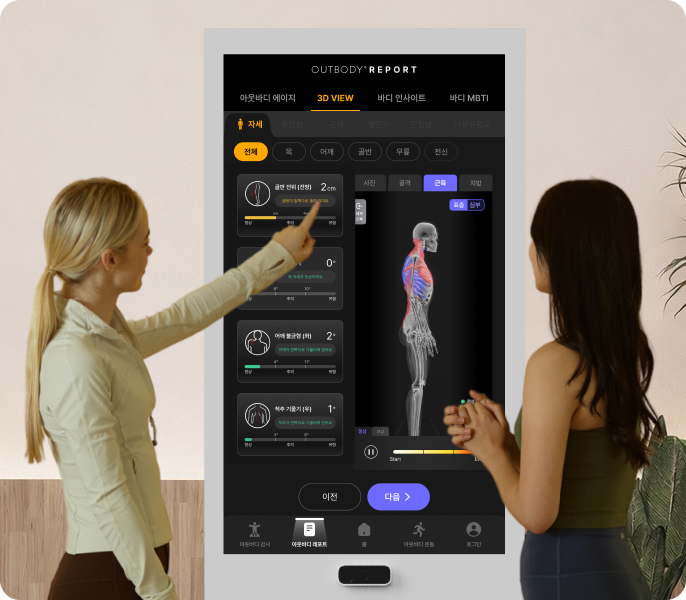 | 검사 항목 | 1. 검사 항목 - 자세 - 유연성 - 사이즈/비율 2. 올인원 360° 아웃바디 검사 | 1. 검사 항목 - 자세 - 유연성 - 근력 - 민첩성 - 밸런스 - 사이즈/비율 2. 올인원 360° 아웃바디 검사 | 1. 검사 항목 - 자세 - 유연성 - 근력 - 민첩성 - 밸런스 - 사이즈/비율 2. 올인원 360° 아웃바디 검사 3. 시니어 전용 낙상 위험도 검사 4. 보행 패턴 검사 5. 유연성 추가: 어깨 외전 검사 6. 근력 추가: 상체 근력 검사 |
